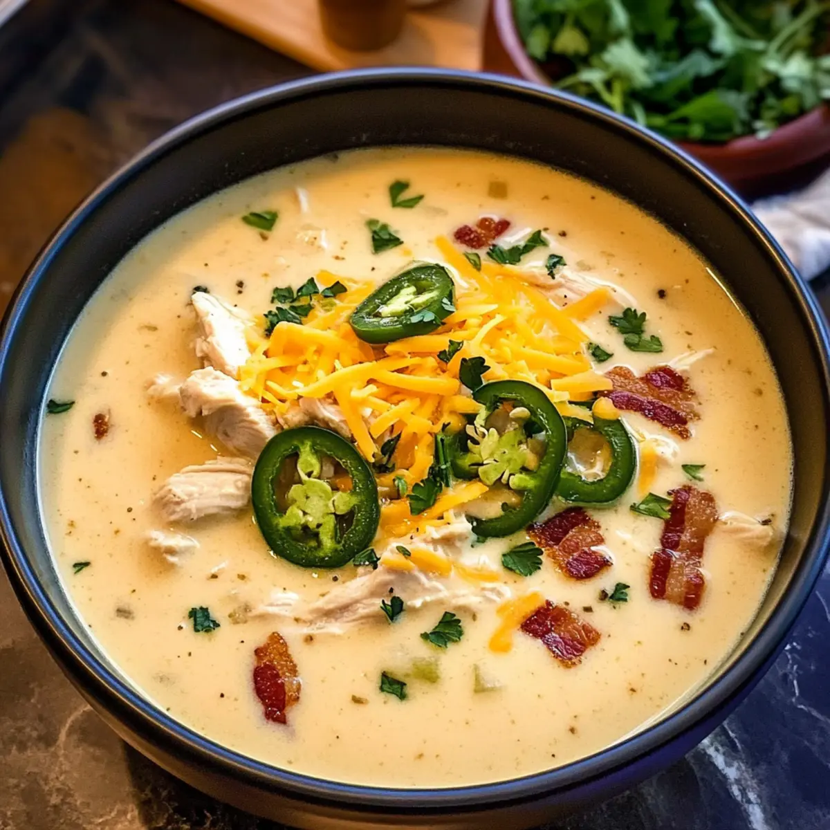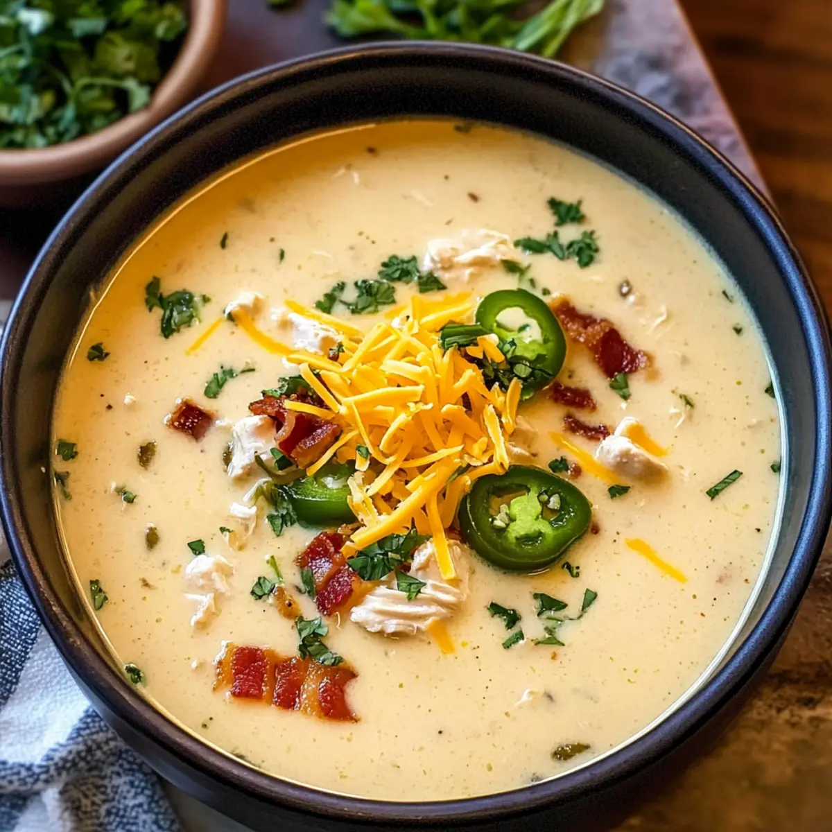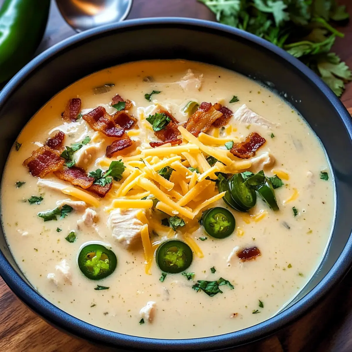 Plötzlich überkam mich der Duft von frisch gebratenem Speck, der durch meine Küche zog, als ich die Vorbereitungen für die Würzige Jalapeño-Popper-Hühnchensuppe traf. Diese köstliche Suppe bringt nicht nur die Aromen eines Jalapeño-Poppers in eine wärmende Schüssel, sondern ist auch eine wunderbare Lösung für kühle Abende oder gesellige Zusammenkünfte. Sie kombiniert cremigen Käse, rauchigen Speck und würzige Jalapeños mit zartem Hühnchen und lässt sich ganz nach deinem Geschmack anpassen. Ob du eine milde Variante bevorzugst oder es gerne schärfer magst, diese Suppe ist ein echter Volltreffer für die Seele und sorgt für wohlige Zufriedenheit. Bist du bereit, deine Küche in ein Genussparadies zu verwandeln? Warum wirst du diese Suppe lieben? Würzige, beruhigende Aromen: Diese Suppe bringt den unverwechselbaren Geschmack eines Jalapeño-Poppers in jedem Löffel zur Geltung und sorgt für wohlige Wärme an kalten Tagen. Vielseitig und anpassbar: Egal, ob du milde oder extra scharfe Aromen bevorzugst, du kannst die Gewürze ganz nach deinem Geschmack anpassen. Schnelle Zubereitung: Mit nur wenigen einfachen Schritten zauberst du eine köstliche Mahlzeit, die du an einem Wochentag oder für besondere Anlässe servieren kannst. Herzhaft und nahrhaft: Diese Suppe ist nicht nur raffiniert, sondern auch nährstoffreich, perfekt für Low-Carb-Diäten und für alle, die eine proteinreiche Option suchen. Ideal für gesellige Anlässe: Serviere die Suppe mit knusprigem Brot oder Tortilla-Chips und schaffe sofort eine gesellige Ess-Atmosphäre – genau richtig für Spielabende oder Familientreffen! Ein schmackhaftes Erlebnis gibt es hier, um deine nächste Zusammenkunft zu verfeinern! Würzige Jalapeño-Popper-Hühnchensuppe Zutaten • Hier findest du alles, was du für diese köstliche Suppe brauchst. Für die Brühe Hühnerbrust oder -schenkel – die Hauptproteinquelle für ein herzhaftes Gericht; kann gewürfelt oder zerrissen verwendet werden. Hühnerbrühe – bildet die Basis der Suppe und verleiht ihr reichhaltigen Geschmack; nimm Gemüsebrühe für eine vegetarische Variante. Für die Cremigkeit Frischkäse – sorgt für eine cremige und reichhaltige Konsistenz; ersetze ihn durch griechischen Joghurt oder vegane Frischkäse-Alternativen für eine leichtere Variante. Schlagsahne oder Halbfettcreme – fügt der Suppe zusätzliche Reichhaltigkeit und Dicke hinzu; verwende Kokosmilch für eine milchfreie Option. Cheddar-Käse – sorgt für einen scharfen, pikanten Geschmack; kann durch Pepper Jack für zusätzliche Schärfe ersetzt werden. Für die Würze Bacon – liefert herzhaften Geschmack und Knusprigkeit; ersetze ihn durch Truthahnspeck oder lasse ihn für eine leichtere Variante weg. Gelbe Zwiebel – fügt Süße und Tiefe hinzu; verwende Schalotten oder Lauch für eine mildere Geschmacksnote. Knoblauch – sorgt für aromatische Qualitäten, die den Geschmack verstärken; in einer Pinch kann Knoblauchpulver verwendet werden. Frische Jalapeños – bietet einen würzigen Kick; passe die Menge an oder entferne die Kerne für eine mildere Version. Gewürze und Optionen Salz & Pfeffer – unerlässlich für die Würze und zur Verbesserung der Aromen. Geräuchertes Paprika (optional) – verleiht einen rauchigen Geschmack; kann weggelassen werden, wenn nicht verfügbar. Kreuzkümmel (optional) – bringt eine warme, erdige Note ein; ideal für einen Tex-Mex-Twist. Für die Garnitur Creme-Frais oder saure Sahne (optional) – verbessert die Präsentation und den Geschmack; belege die Suppe mit Koriander, gehackten Jalapeños oder Frühlingszwiebeln für zusätzlichen Genuss. Diese Würzige Jalapeño-Popper-Hühnchensuppe wird dir nicht nur schmecken, sondern auch deine Sinne beleben! Schritt-für-Schritt-Anleitung für die Würzige Jalapeño-Popper-Hühnchensuppe Step 1: Speck anbraten In einem großen Dutch Oven den gewürfelten Speck bei mittlerer Hitze für etwa 7-10 Minuten braten, bis er knusprig ist und eine goldene Farbe annimmt. Achte darauf, etwas vom Fett im Topf zu lassen, da es der Suppe zusätzliche Aromen verleiht. Rühre gelegentlich um, damit der Speck gleichmäßig brät. Step 2: Gemüse anbraten Füge die gewürfelte Zwiebel hinzu und brate sie für etwa 3-5 Minuten an, bis sie glasig ist. Danach den gehackten Knoblauch und die geschnittenen Jalapeños hinzufügen und für weitere 1-2 Minuten anbraten, bis sie aromatisch duften. So entfalten sich die Aromen perfekt für die Würzige Jalapeño-Popper-Hühnchensuppe. Step 3: Hühnchen hinzufügen Wenn du rohes Hühnchen verwendest, leg die gewürzten Teile in den Topf und brate sie für 3-4 Minuten pro Seite an, bis sie leicht gebräunt sind. Wenn du bereits gekochtes Hühnchen verwendest, kannst du es später hinzufügen. Achte darauf, das Gemüse gut mit dem Speck zu vermischen. Step 4: Brühe und köcheln lassen Gieße die Hühnerbrühe in den Topf und schabe den Boden ab, um alle leckeren Bratreste zu lösen. Bring die Mischung zum Kochen und reduziere dann die Hitze, um sie 15-20 Minuten lang leicht köcheln zu lassen. So können die Aromen in deiner Würzigen Jalapeño-Popper-Hühnchensuppe gut verschmelzen. Step 5: Hühnchen zerkleinern Wenn das Hühnchen zart ist, nimm es aus dem Topf und zerkleinere es mit zwei Gabeln oder einem Fleischzerkleinerer. Gib das zerkleinerte Hühnchen zurück in die Suppe und rühre gut um, damit es sich gleichmäßig verteilt. Dies sorgt für eine wunderbar herzhafte Konsistenz. Step 6: Cremigkeit hinzufügen Reduziere die Hitze auf niedrige Stufe und füge den weich gewordenen Frischkäse hinzu. Rühre gründlich, bis er vollständig aufgelöst ist, gefolgt von dem geriebenen Cheddar und der Sahne. Lass die Suppe sanft köcheln, um ein Verklumpen zu vermeiden und eine cremige Textur zu erhalten. Step 7: Abschmecken und anpassen Lass die Suppe für weitere 5-7 Minuten köcheln und schmecke sie ab. Würze sie mit Salz, Pfeffer und optionalen Gewürzen wie ger
