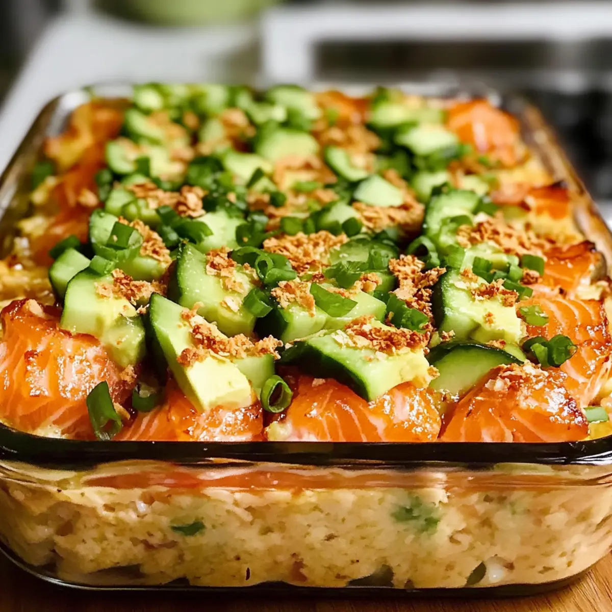 Würziger Lachs Sushi Auflauf: Eine köstliche Fusion aus Sushi und Auflauf für entspannte Abende.