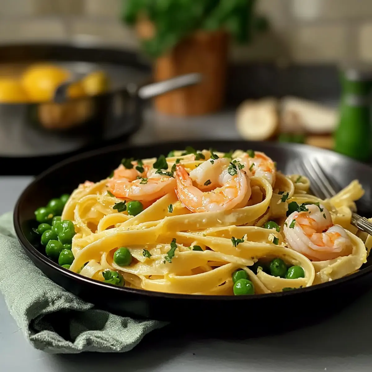 Gib die abgetropften Fettuccine und die Erbsen in die Pfanne mit der Garnelen-Sauce. Mische alles gut durch und lasse es 1-2 Minuten bei niedriger Hitze ziehen. So können die Nudeln die Aromen der Zitronen-Fettuccine mit Knoblauchgarnelen aufnehmen.