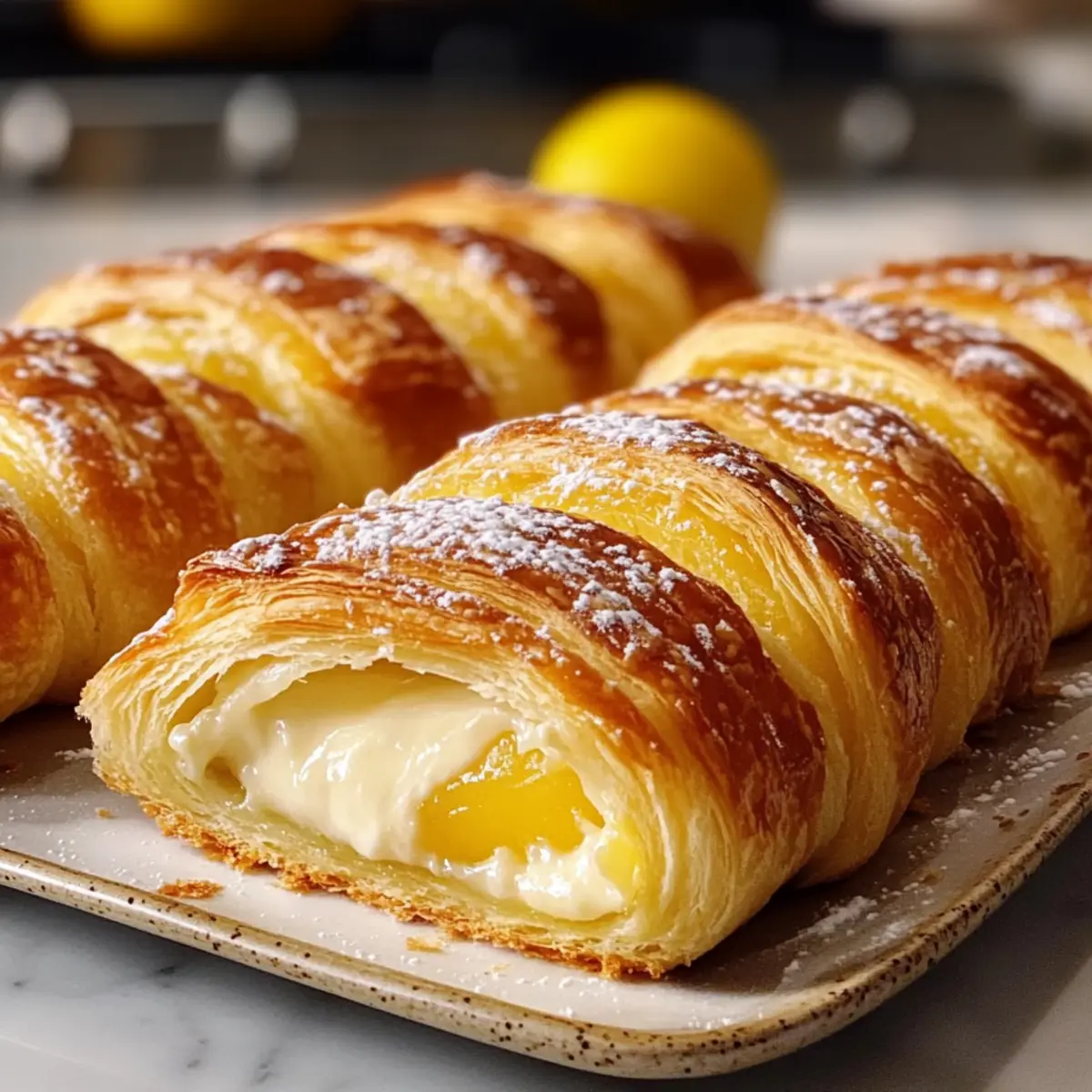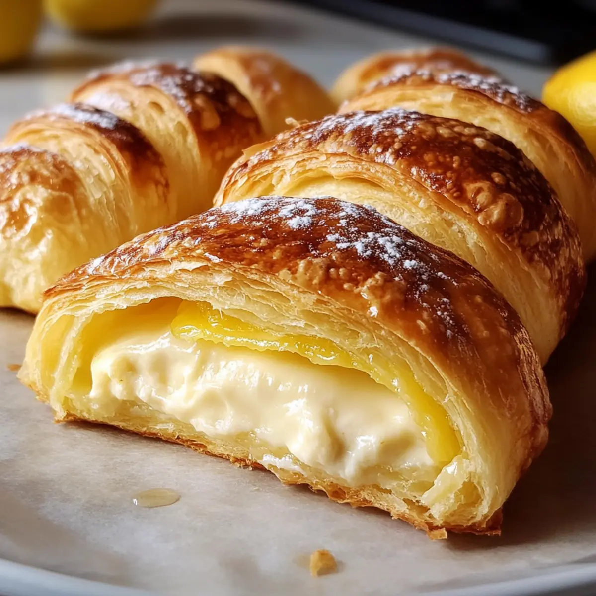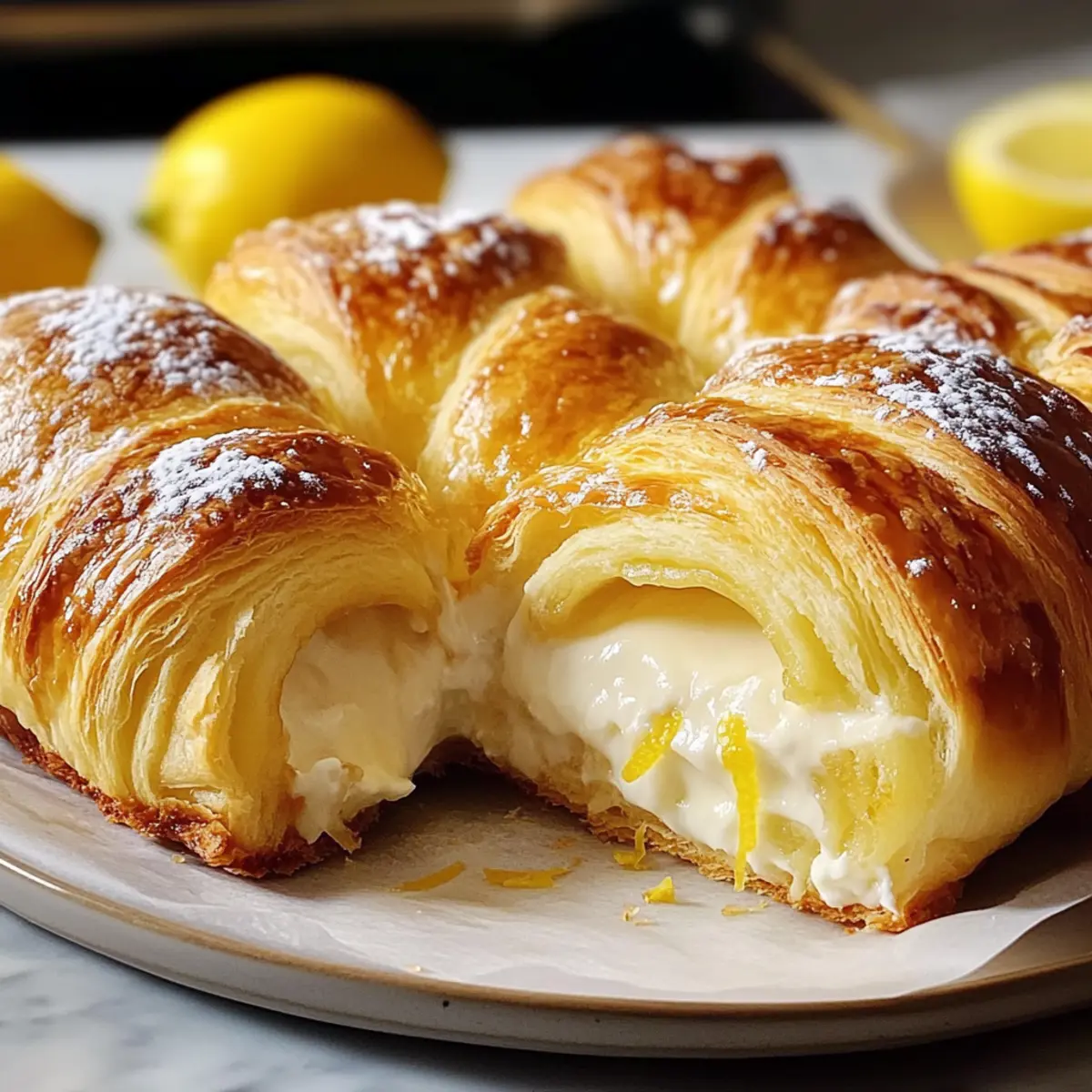 Während ich in meiner Küche stand, durchdrang mich der verlockende Duft frisch gebackener Leckereien und ich wusste sofort, dass es Zeit für etwas Besonderes war: Zitronen-Käsekuchen-Croissant-Rollen. Diese himmlischen kleinen Teilchen kombinieren die spritzige Frische von Zitrone mit der cremigen Fülle eines Käsekuchens, umhüllt von blättrigem, goldbraunem Croissant-Teig. Das Beste daran? Sie sind in nur 25 Minuten zubereitet, was sie zu einer fantastischen Wahl für ein schnelles Frühstück oder einen verführerischen Nachmittagssnack macht. Wenn du deine Gäste mit einem unwiderstehlichen Dessert beeindrucken möchtest, wirst du bei diesen Rollen sicher fündig. Glaubst du, dass du dich zurückhalten kannst, nachdem du den ersten Bissen probiert hast? Warum wirst du dieses Rezept lieben? Einfachheit: Die Zubereitung dieser Zitronen-Käsekuchen-Croissant-Rollen ist kinderleicht und benötigt keine speziellen Backkenntnisse. Frischer Geschmack: Die Kombination aus spritziger Zitrone und cremigem Käsekuchen bringt einen unvergleichlichen Geschmack auf deinen Tisch. Schnell zubereitet: In nur 25 Minuten verwandeln sich einfache Zutaten in ein luxuriöses Dessert – perfekt für unerwartete Gäste! Vielseitigkeit: Ob zum Frühstück oder als nachmittäglicher Snack, diese Rollen passen immer. Vielleicht sogar mit einer Tasse Tee oder frischem Obstsalat! Besonderer Auftritt: Durch die dekorativen Garnituren wie Zitronenzesten wirken die Rollen beeindruckend und laden zum Genießen ein. Köstliche Aromen: Diese kleinen Teilchen vereinen die beste Mischung aus süß und sauer und machen sie zu einer unwiderstehlichen Versuchung. Zutaten für Zitronen-Käsekuchen-Croissant-Rollen • Für die Füllung: Frischkäse – sorgt für eine cremige, würzige Füllung. Ein fettärmerer Frischkäse kann verwendet werden, könnte jedoch die Textur verändern. Zucker (Kristallzucker) – bringt die nötige Süße, um die Säure der Zitrone auszubalancieren. Keine Alternativen empfohlen, da es für den Geschmack entscheidend ist. Frisch geriebene Zitronenschale – bietet ein intensives Zitronenaroma. Bei Mangel an frischer Schale kann auch Flaschen-Zesten verwendet werden, aber weniger aufgrund der Konzentration. Zitronensaft – verbessert den Geschmack und verleiht der Füllung Säure. Frischer Saft wird für die besten Ergebnisse empfohlen. • Für den Teig: Croissant-Teig – bildet die Basis der Rollen und sorgt für Blätterteig. Vorgefertigter, gekühlter Teig wird für die Bequemlichkeit verwendet; keine Alternativen vorgeschlagen. • Für die Glasur: Puderzucker – wird für die Glasur verwendet, um Süße und eine dekorative Note hinzuzufügen. Butter (geschmolzen) – wird vor dem Backen auf die Oberseite gestrichen, um eine goldene Farbe zu erzielen. Optional kann Öl verwendet werden. • Optionales Garnieren: Frische Zitronenschale oder essbare Blumen – für eine ansprechende Präsentation und zusätzlichen Geschmack. Mit diesen Zutaten bereitest du im Handumdrehen köstliche Zitronen-Käsekuchen-Croissant-Rollen zu, die deine Familie und Freunde lieben werden! Schritt-für-Schritt-Anleitung für Zitronen-Käsekuchen-Croissant-Rollen Step 1: Ofen vorheizen Heize den Ofen auf 190°C (375°F) vor und bereite ein Backblech mit Backpapier vor oder fette es leicht ein, um ein Ankleben der Zitronen-Käsekuchen-Croissant-Rollen zu verhindern. Während der Ofen aufheizt, hast du genügend Zeit, die Füllung vorzubereiten, damit alles reibungslos läuft. Step 2: Füllung zubereiten In einer mittelgroßen Schüssel vermenge den weich gewordenen Frischkäse, den Kristallzucker, die frisch geriebene Zitronenschale und den Zitronensaft. Rühre alles gut um, bis die Mischung schön glatt und cremig ist. Achte darauf, dass keine Klumpen entstehen, da die Füllung sonst unangenehm sein könnte. Step 3: Croissant-Teig vorbereiten Öffne die Packung mit dem Croissant-Teig und rolle ihn vorsichtig aus. Teile den Teig entlang der vorgegebenen Trennlinien in Dreiecke. Platziere je einen gehäuften Esslöffel der cremigen Füllung auf der breiten Seite jedes Dreiecks. Dies sorgt für eine üppige Füllung deiner Zitronen-Käsekuchen-Croissant-Rollen. Step 4: Rollen formen Beginne, das Dreieck von der breiten Seite her aufzurollen und achte darauf, dass die Füllung gut verschlossen ist. Drücke das Ende leicht an, damit es sich beim Backen nicht öffnet. Lege die geformten Rollen mit der Spitze nach unten auf das Backblech und sorge dafür, dass sie etwas Abstand haben, um gleichmäßig zu backen. Step 5: Rollen bestreichen Schmelze die Butter und bestreiche die Oberseite jeder Rolle gleichmäßig mit einem Pinsel. Dies verleiht den Zitronen-Käsekuchen-Croissant-Rollen eine goldene und appetitliche Farbe während des Backvorgangs. Achte darauf, großzügig vorzugehen, um das beste Ergebnis zu erzielen. Step 6: Backen Schiebe das Backblech in den vorgeheizten Ofen und backe die Rollen für 12–15 Minuten. Halte während des Backens ein Auge auf die Croissant-Rollen – sie sollten goldbraun und aufgebläht sein. Die perfekte Farbe signalisiert, dass sie bereit sind, aus dem Ofen genommen zu werden. Step 7: Glasur zubereiten Während die Rollen im Ofen sind, kannst du die Glasur vorbereiten. Vermische in einer kleinen Schüssel den Puderzucker mit dem Zitronensaft, bis eine glatte, dickflüssige Glasur entsteht. Diese verleiht den Zitronen-Käsekuchen-Croissant-Rollen eine süße, glänzende Schicht, die den Geschmack intensiviert. Step 8: Rollen glasieren Nehme die frisch gebackenen Rollen vorsichtig aus dem Ofen und lasse sie für einige Minuten abkühlen. Mit einem Löffel oder einer Spritze träufelst du die Zitronenglasur über die warmen Rollen. Für den letzten Schliff kannst du zusätzlich frisch geriebene Zitronenschale darüberstreuen, um das Aroma zu intensivieren. Tipps zur Vorbereitung der Zitronen-Käsekuchen-Croissant-Rollen Die Zitronen-Käsekuchen-Croissant-Rollen sind ideal für
